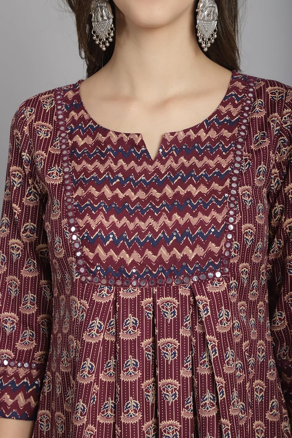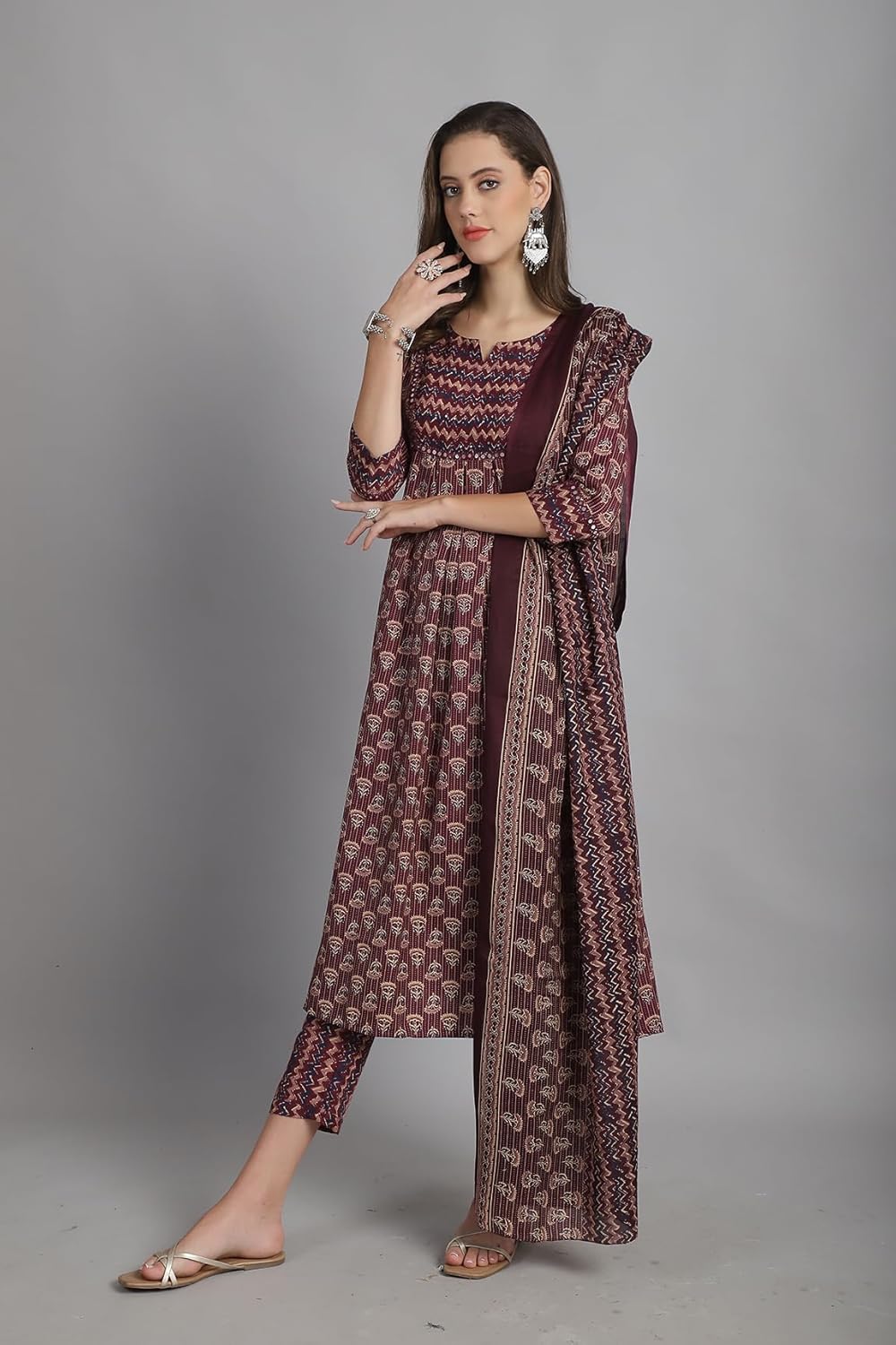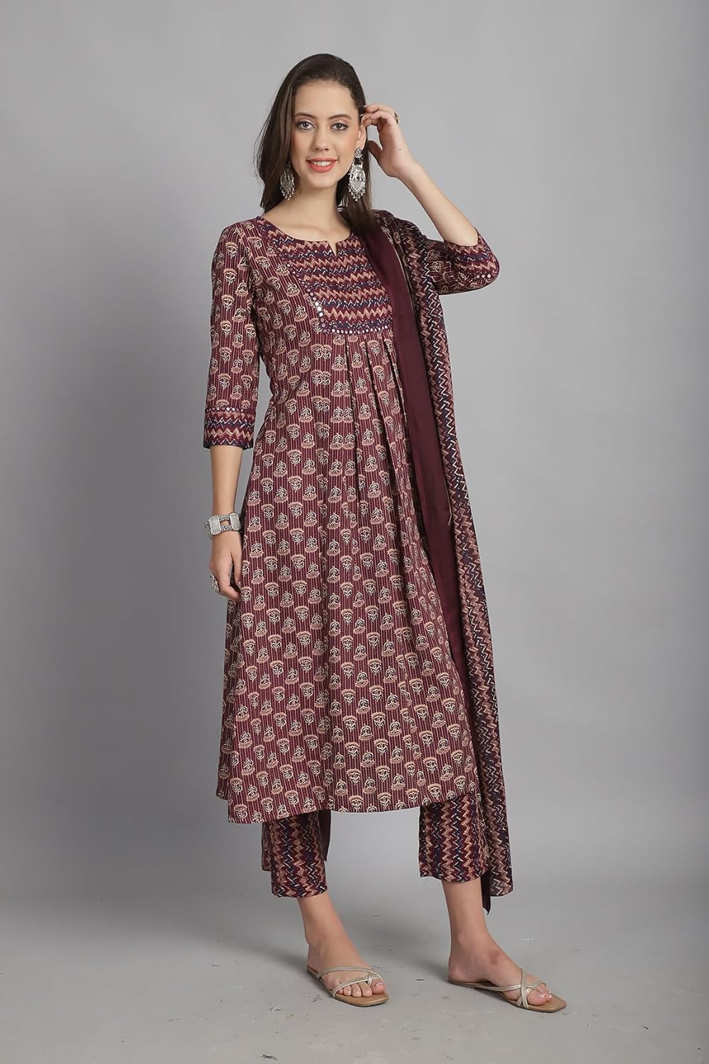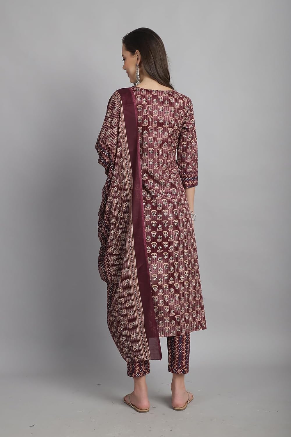 Kurta Color- Wine & Beige, Pant Color- Wine & Beige, Dupatta Color- Wine & BeigeKurta Fabric- Cotton Blend, Pant Fabric- Cotton Blend, Dupatta Fabric- Cotton BlendKurta Work- Jaipuri Printed, Pant Work- Zig Zag Print, Dupatta Work- Jaipuri Printed, Work Type- Floral Printed, Sequins with Mirror WorkPackage Contains- 1 X Kurta | 1 X Pant | 1 X Dupatta