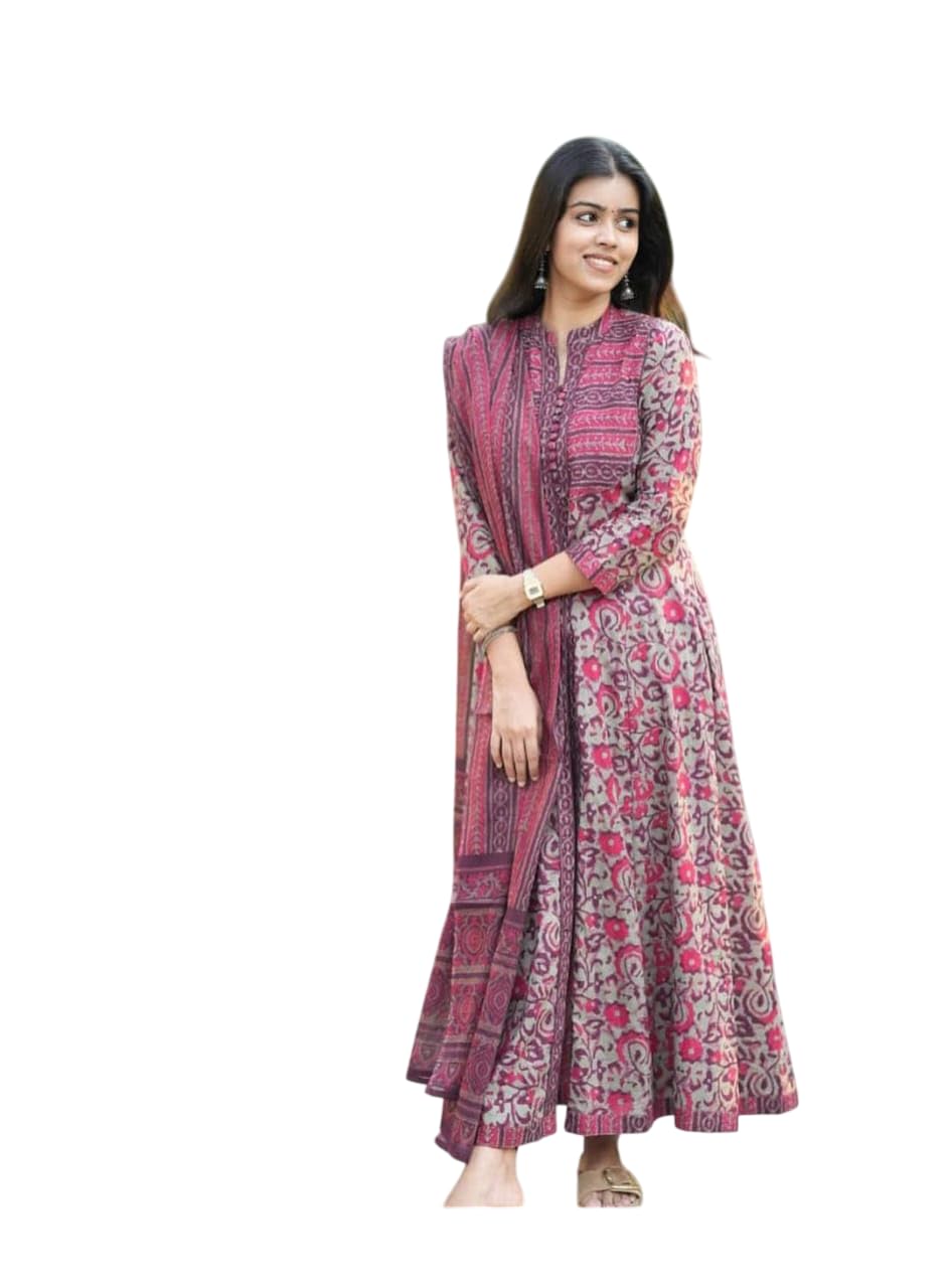 Elevate your ethnic wardrobe with this stunning Kurta palazzo suit set. The ensemble features intricate embroidered motifs in a medallion pattern, adorning the cotton kurta with artistic precision. The coordinating palazzo pants offer both style and comfort, while the matching dupatta with delicate tassels and striped detailing adds a graceful finishing touch. The full sleeves and round neckline enhance the traditional silhouette, making it perfect for festivals, celebrations, or special occasions. The rich PINK hue complements various skin tones, while the cotton fabric ensures comfort throughout the day. The set showcases beautiful craftsmanship with detailed embroidery work and thoughtful design elements like the decorative border on the dupatta. The palazzo-style bottoms provide ease of movement while maintaining a sophisticated appearance. This versatile three-piece set can be accessorised with traditional jewellery and footwear to create a complete festive look. Gentle hand wash recommended to maintain the vibrancy of the embroidery and fabric.