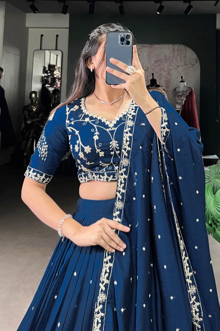 Women’s Embroidered Vichitra Silk Lehenga Choli Dupatta Set Semi-Stitched Blouse and Fit & Flare Style