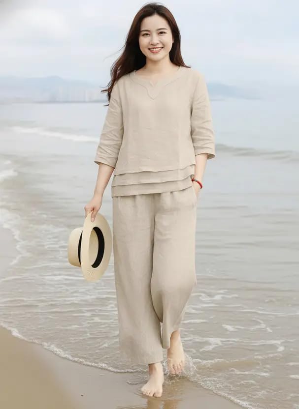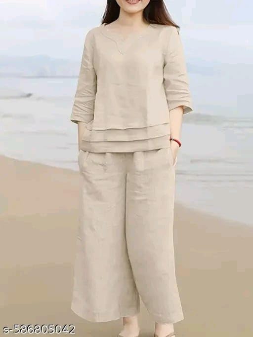 This stylish women’s rayon blend co-ord set combines comfort and elegance in one versatile outfit. The set features a sophisticated 3/4 sleeve top with a flattering V-neckline and layered design that creates a beautiful silhouette. The top measures 71 cm in length, providing perfect coverage whilst maintaining a contemporary look. Paired with wide-leg palazzo trousers measuring 96 cm in length, this ensemble offers both comfort and style for any occasion. The rayon blend fabric ensures breathability and a soft feel against the skin, making it ideal for all-day wear. Available in multiple colours including rust orange, beige, and navy blue, this co-ord set is perfect for casual outings, office wear, or semi-formal events. The relaxed fit and flowing palazzo pants provide freedom of movement whilst the structured top adds a polished touch to your wardrobe.