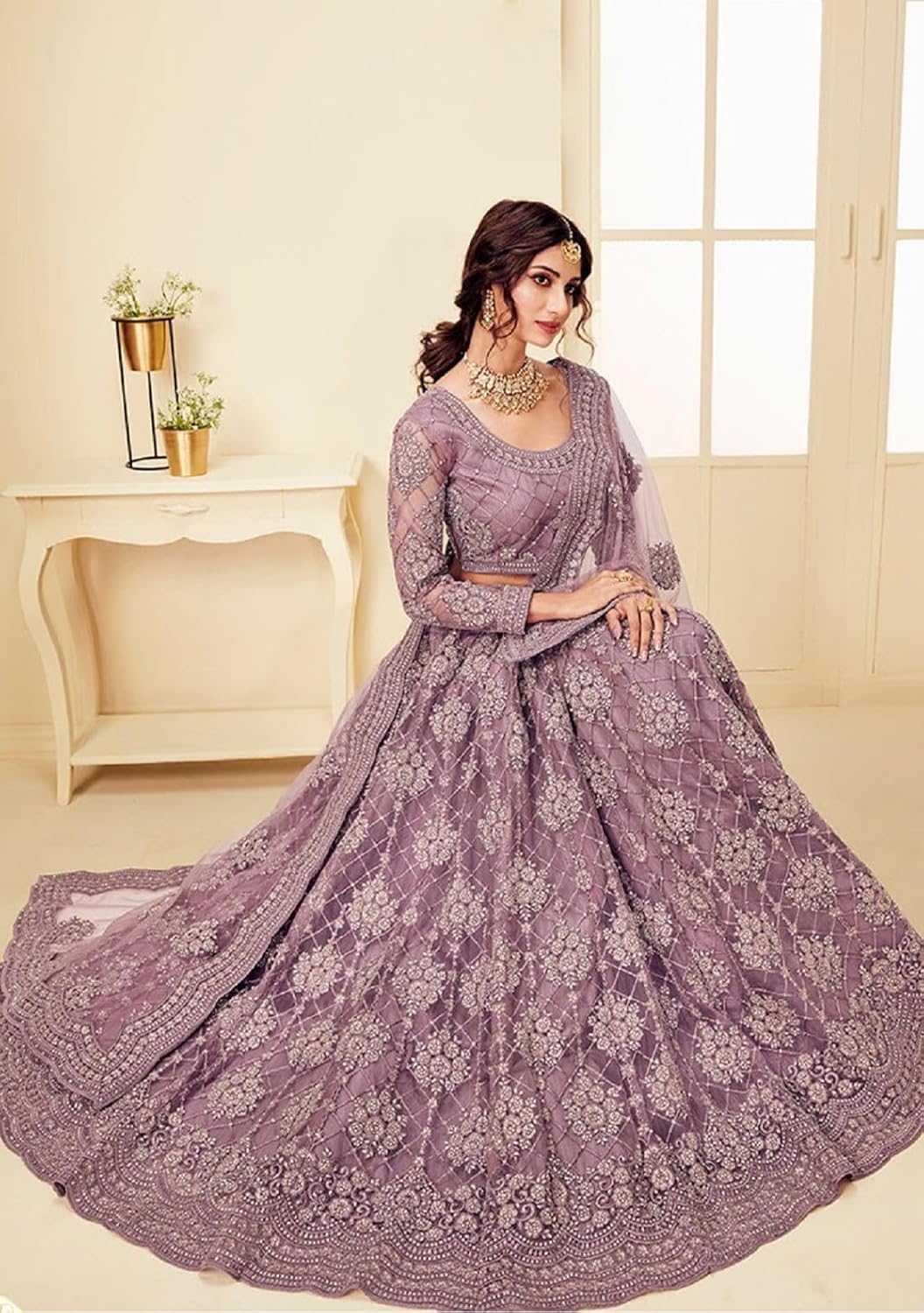 Women’s Semi Stitched Net Lehenga Choli with Embroidered Pattern Unstitched Blouse Piece and Dupatta Set | Women’s Lehenga Choli