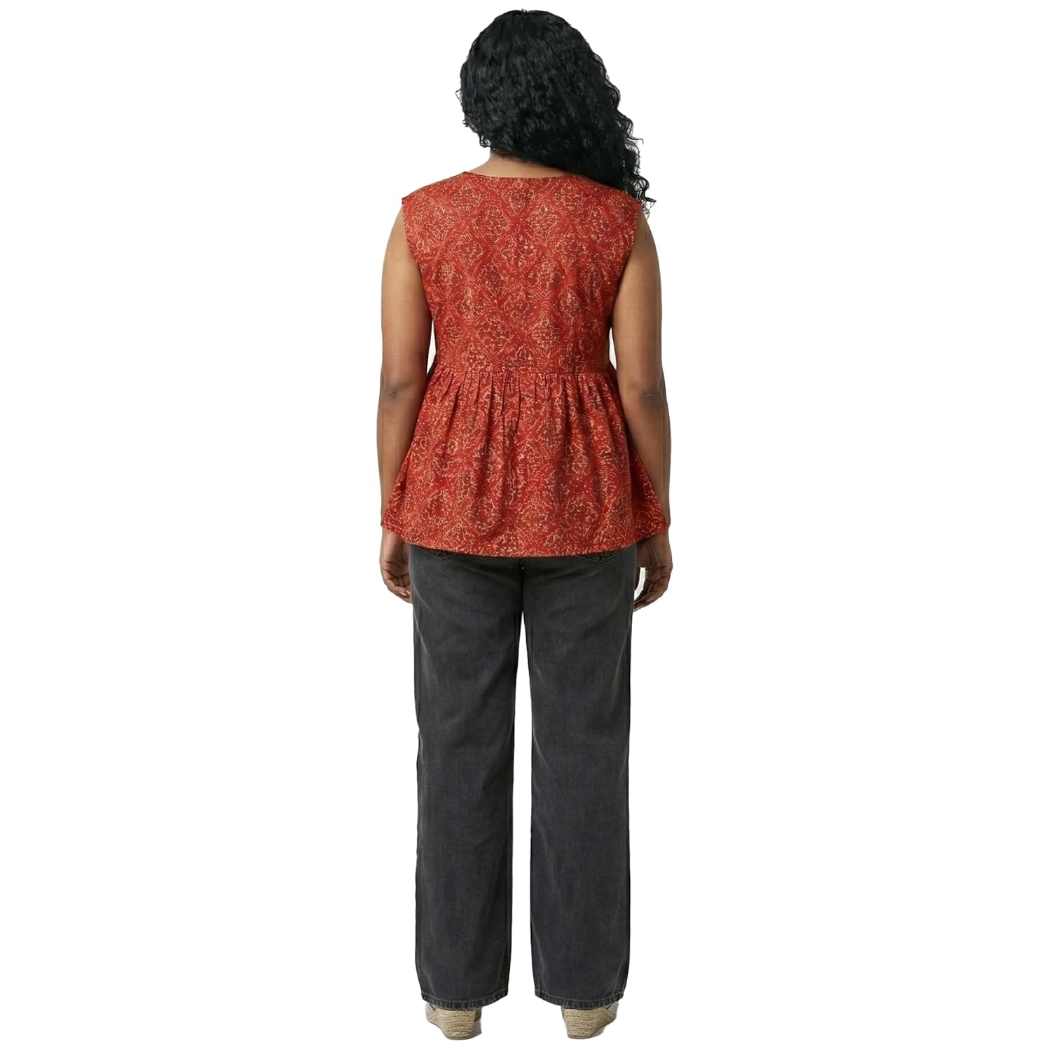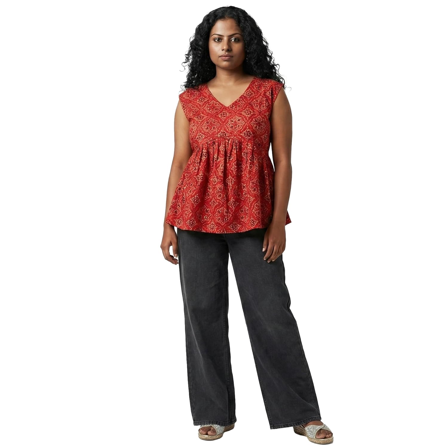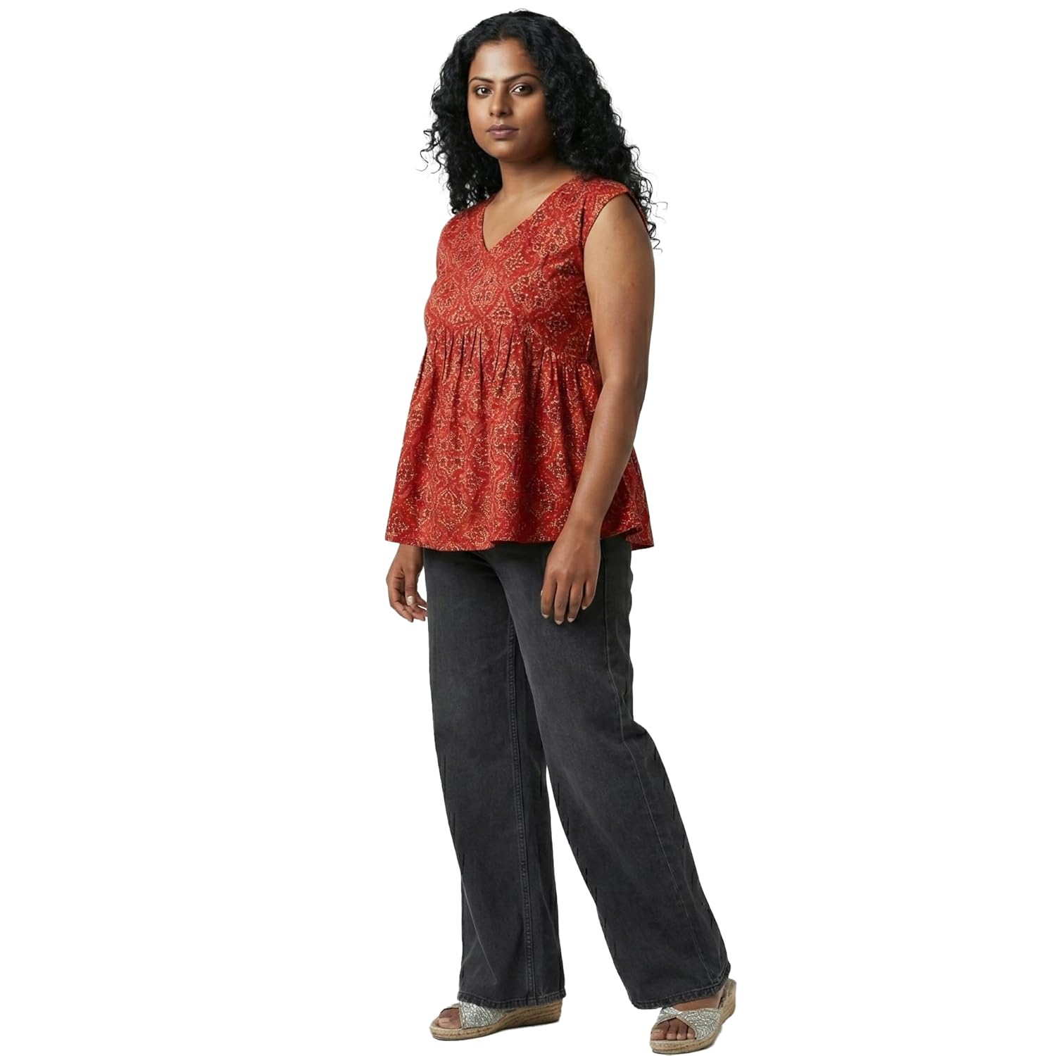 This elegant Prayagi short sleeveless kurthi for women combines traditional Indian style with contemporary design sensibilities. Featuring a beautiful floral print in warm earthy tones, this kurthi showcases intricate detailing that adds visual interest to your wardrobe. The flattering V-neckline and cap sleeves create a feminine silhouette, whilst the gathered waist provides a comfortable yet stylish fit that suits various body types. Perfect for casual outings, office wear, or festive occasions, this versatile piece can be paired effortlessly with jeans, leggings, or traditional bottoms. The sleeveless design makes it ideal for warmer climates whilst maintaining modest coverage. The flowing peplum style adds movement and grace to your look, making you feel confident and comfortable throughout the day. This kurthi represents the perfect blend of traditional craftsmanship and modern fashion sensibilities, allowing you to embrace your cultural heritage whilst staying on-trend. Please refer to the sizing chart before placing your order to ensure the perfect fit.