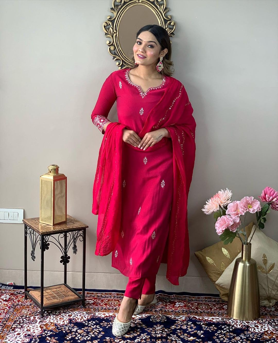 Generic Name : Women Pink Embroidered Chanderi Fabric Straight Kurta, Pant and Dupatta Set