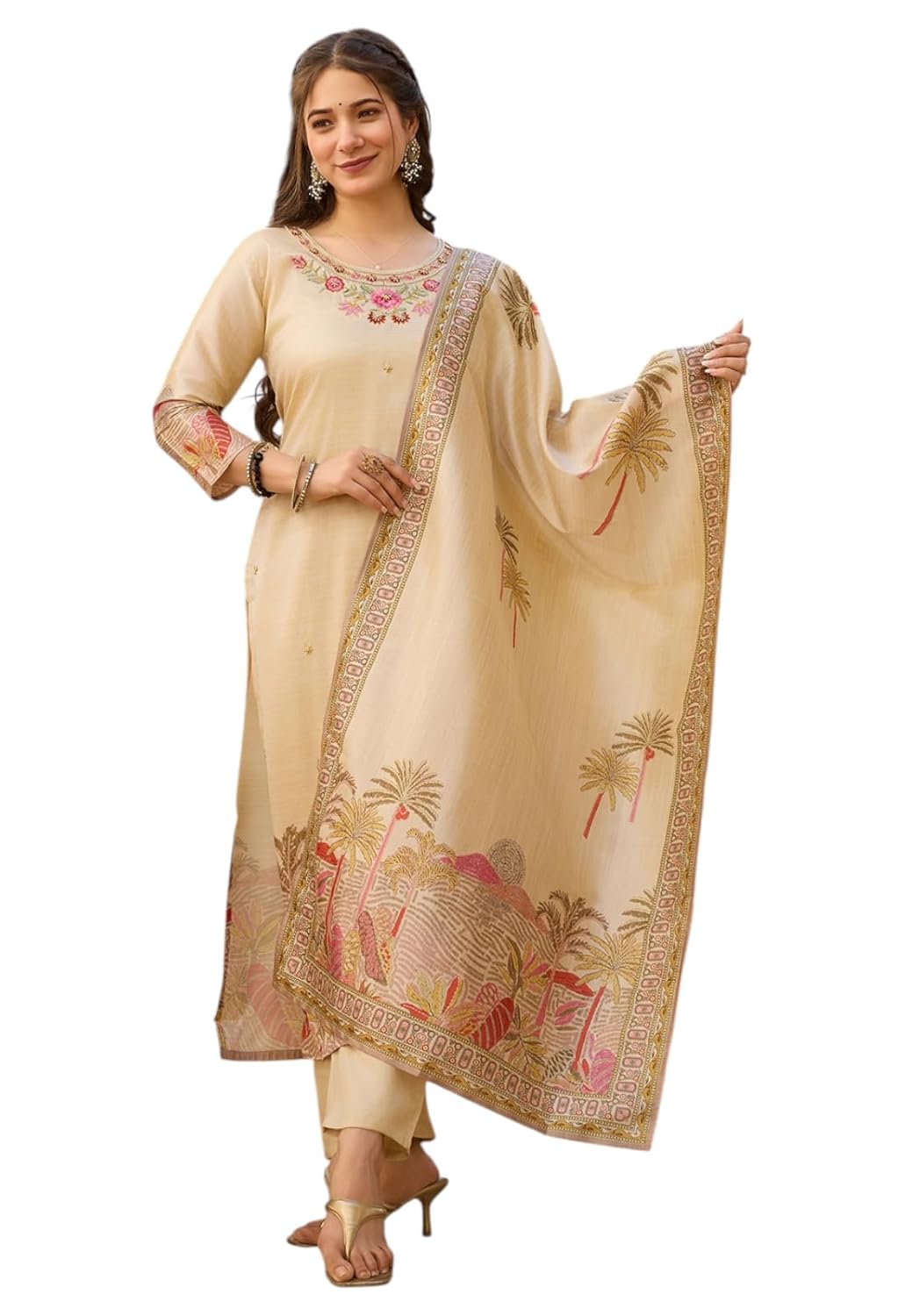 Generic Name : Women’s Beige Viscose Assam Silk Fabric Straight Printed Kurta, Pant and Dupatta Set | Kurta Set For Women