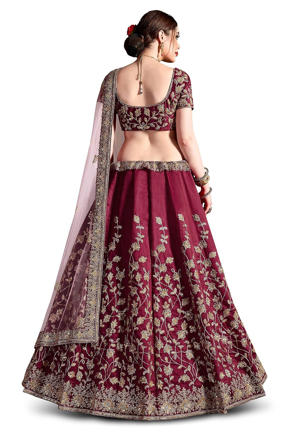 Featuring a Maroon Raw silk lehenga embellished with zari embroidery on floral pattern adorned with sequins. It comes along with matching blouse embellished with zari embroidery and sequins work all over. Make your events like wedding, engagement and evening to dress up your beauty.